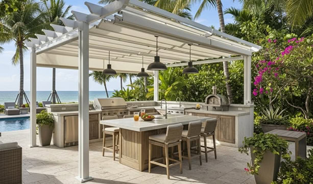 Complete your backyard with summer kitchens, pergolas, fire pits, and premium decking.