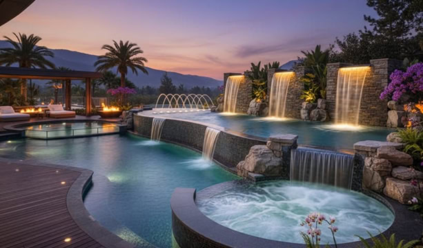 Elevate your pool with therapeutic spas, cascading waterfalls, bubblers, and deck jets.